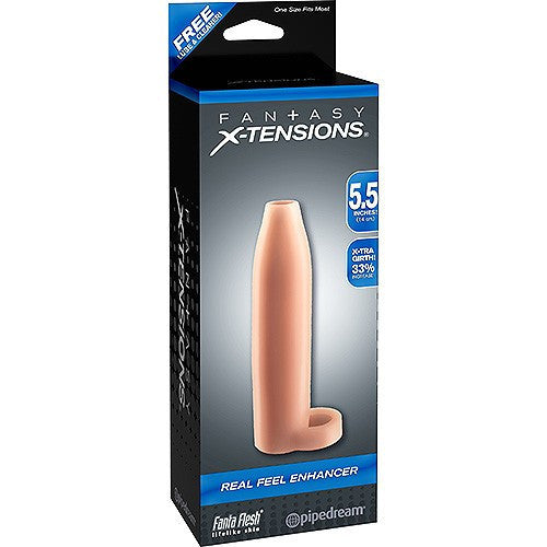 The Real Feel Enhancer is a customizable sleeve that can be easily trimmed at the tip for a perfect fit. The thick enhancer features an open-ended head so you can feel every sensation and still enjoy the natural touch of your lover. It's super-stretchy to accommodate most sizes, snug enough to help you last longer, and features a ball strap to prolong ejaculation for explosive climaxes. The super-soft Fanta Flesh sleeve makes you 33% thicker.